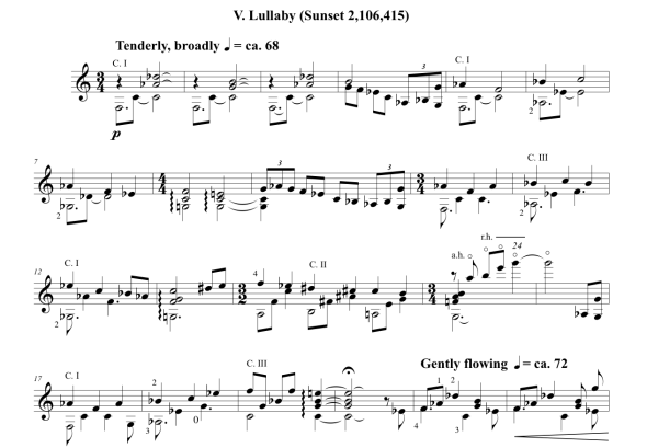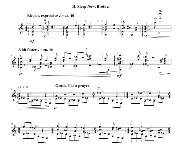 I’ve always been interested in vocal music, and “Songbook” is a song cycle where the guitar plays both the vocal and accompaniment parts. This was a very pleasant piece to write, and it felt natural and easy to come up with lyrical, mood-specific music.